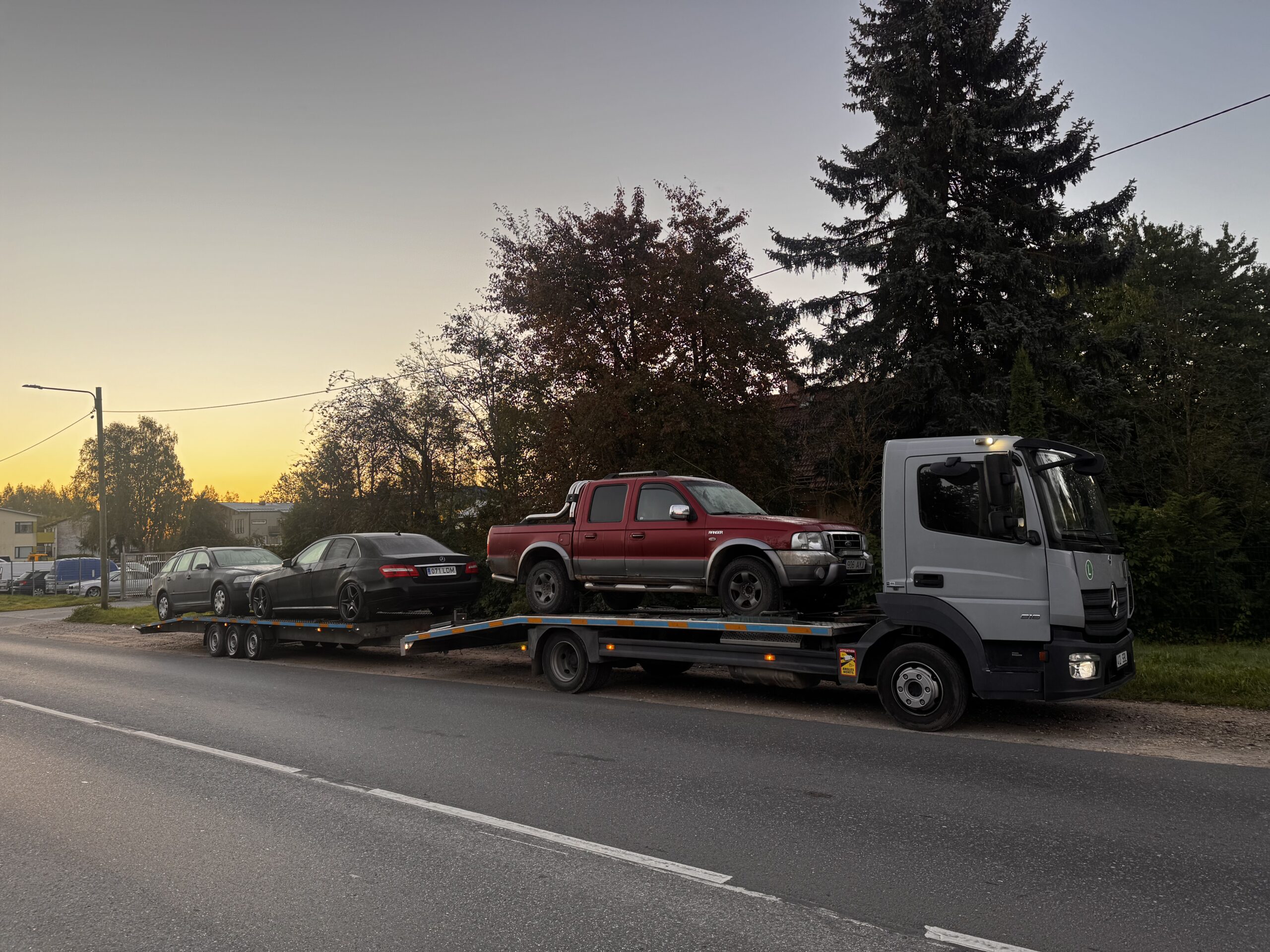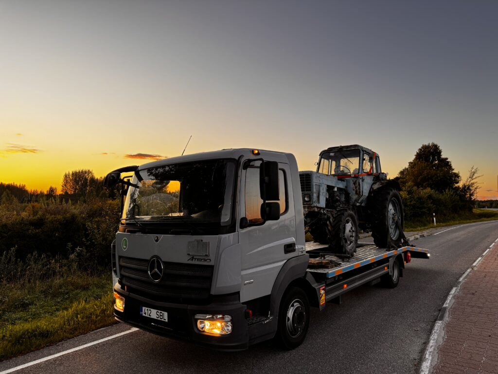 Meie käsutuses on Mercedes Atego koos järelhaagisega, mis võimaldab vedada nii sõiduautosid, kaubikuid, haagiseid kui ka muud spetsiaalset tehnikat.